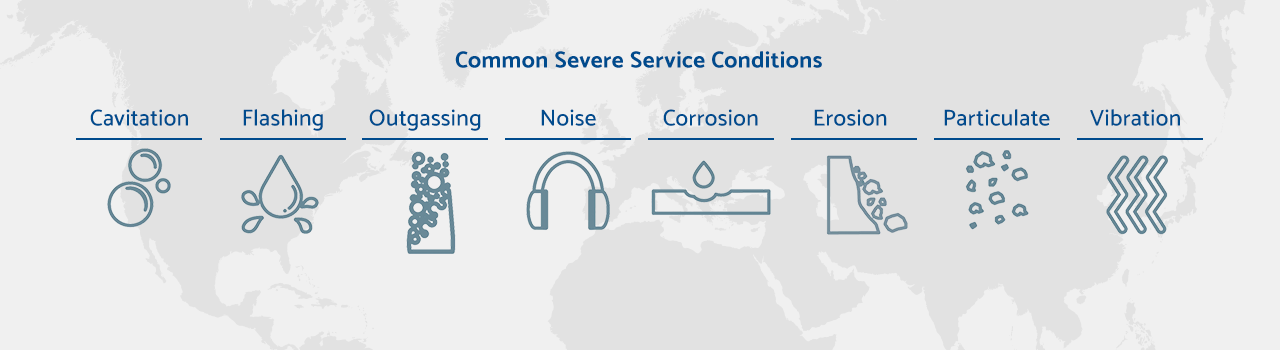 Severe service control valves are used in the most difficult installations within your process plant. These installations commonly include cavitating, erosive, corrosive, noisy, high pressure, high temperature, high pressure drop, or high velocity media. To maximize longevity in these harsh conditions, severe service control valves typically utilize extremely hard materials, materials that withstand temperature and pressure extremes, bodies with special flow paths, bodies with high capacities, and cages with unique flow passages. A severe service valve may or may not be a critical service valve—one that’s essential to the operation of the plant.
