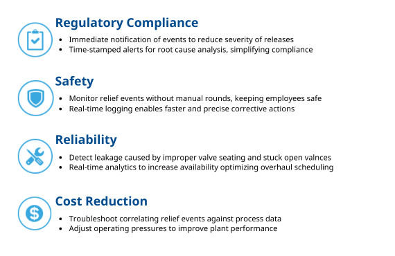 Monitor modulating pilot operated pressure relief valves with the Rosemount 2051 and 3051 Differential Pressure Transmitters. Wired and Wireless Options available. Calculate volumetric release data. Long operation range power module.